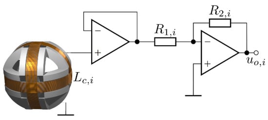 The measurement circuit consisted of three parts: an inverting amplifier, a precision rectifier, and an averaging circuit with operational amplifiers. The inverting amplifier, together with an input buffer circuit, is presented in Figure 5. The single-axis search coil was denoted with inductance Lc,i, where i can be x, y, or z. One terminal of the coil was connected to the ground and the other terminal was connected to the input of the measurement circuit.