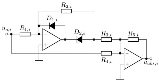 The gain of the precision half-wave rectifier with a gain was defined by R1,i and R2,i. The second stage was the addition circuit, which added the original input signal to the output of the first stage. The gain of the addition circuit was determined with R3,i, R5,i, and R4,i. In the case of the measurement circuit, the gain of the measurement rectifier was 1. The values of the resistors required for unity gain rectification can be calculated using: