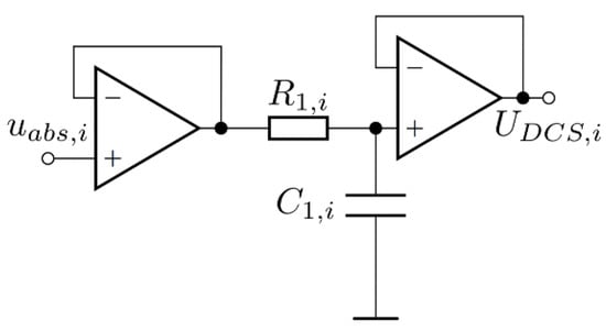The third and last part of the measurement circuit was the averaging circuit. The purpose of this circuit was to convert the rectified AC voltage to DC voltage. The output of the circuit was the average value of the input voltage. The averaging circuit could also be replaced with a peak detector circuit. The circuit of the third and last stage is presented in Figure 9. It consisted of an input buffer amplifier, a low-pass RC filter, and an output buffer amplifier. The input voltage was rectified voltage uabs,i, and the output voltage was the DC representation of the rectified AC voltage UDC,i.
