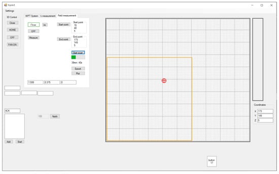 The computer application for measuring magnetic flux density was developed using the Microsoft Visual Studio using C#. The user interface of the application is presented in Figure 12. The interface included the measurement circuit control panel and the transmitter coil position grid. The main purpose of the application was the interaction between the 3D positioning mechanism and the search coil magnetometer. The graphic positioning grid interface was used for positioning the bottom platform with the transmitter coil in the x and y-axes and setting the vertical z distance between the 3D search coil and the transmitter coil.