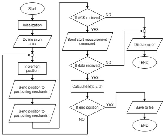 To scan the magnetic field of the transmitter coil, the boundaries of the scan area must be defined using the start and the endpoints. The user can also determine the scanning step size. The smallest movement step in the x, y, or z direction was set at 1 mm. With the scan area defined, the measurement of magnetic flux density can start. The search coil moves incrementally within the designated area. At each point in the space, the application sends the command to the search coil magnetometer to perform the voltage measurement. Data are then transferred from the search coil magnetometer to the application. The magnetic flux density is then calculated and saved in the Random Access Memory (RAM). If the measurement data is transferred correctly, the coil can be moved into the next position. At the end of the measurement, data from the RAM can be exported as a .csv file for further analysis and visualization. The measurement procedure is described using the flowchart in Figure 13.