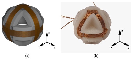 The main part of the search coil magnetometer was a 3D search coil without a ferromagnetic core. The purpose of the search coil was magnetic field measurement in the 3D space, i.e., in the x, y, and z directions. The 3D search coil consisted of three single axis search coils. The single axis search coils ere wound around the sphere and rotated 90° to each other. Each of the three coils was used to measure magnetic flux density along one specific axis. Because of the position and angle between the coils, the coupling coefficient between the coils was zero. This meant that the x component of magnetic flux density induced voltage only in the x-axis sense coil, i.e., it induced no voltage in the other two coils. The same was true for the y and z components of the magnetic flux density, which induced voltage only in the y and z single axis search coils, respectively. The modeled and fabricated 3D search coils are presented in Figure 14.