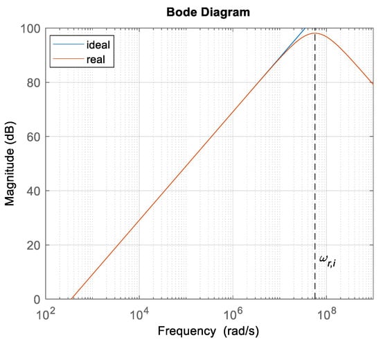 In the case of a 3D flux magnetometer, all coils have the same parameters. The self-inductance Lc,i was 17.6 μH, the parasitic capacitance Cc,i was 17.8 pF and the resistance of the wire was 1.4 Ω. Therefore, the self-resonant frequency of the single-axis search coil was 9 MHz (56.5 × 106 rad/s). The bode plot of transfer function (37) is presented in Figure 17. The blue line represents the real transfer function with resonant frequency and the red line represents the ideal transfer function of the search coil. Under the resonant frequency, the ideal search coil behaved similarly to the nonideal search coil. The magnetic field measurements performed with the proposed system were under the self-resonant frequency of the coil. Therefore, the bandwidth of the magnetic field measurement circuit was limited by the precision rectifier and the RC filter.