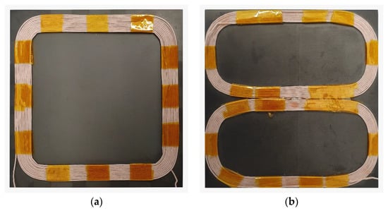 The parameters of the used system are presented in Table 2, including the inductance of the square coil and the inductance of the DD coil, the transmitter coil excitation currents, input voltage of the inverter, and switching frequency of the phase-shifted PWM. The coils were designed to have similar inductance and footprints. Both coils were shielded with a 100 mm × 10 mm × 6 mm ferrite plate.