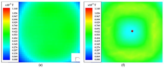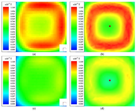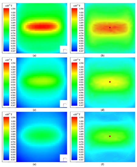 The comparisons between the simulated and measured results are presented in Figure 20 and Figure 21, respectively. The diagrams present the absolute magnetic flux density in three different x-y planes, located at 15 mm, 20 mm, and 25 mm. The figures on the left side present the measured results and the figures on the right side present the simulated results. The results are presented using a color scale. The blue color defines the weakest magnetic flux density, and the red color defines the strongest magnetic field.