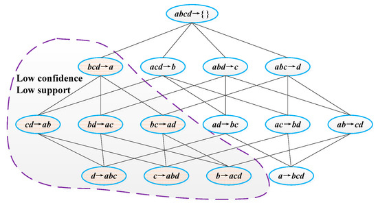 Simple association rules are generated from the frequent item sets, and association rules with confidence levels greater than the threshold value are selected to form an effective rule set. If is greater than the confidence threshold specified by the user (see Equation (2)), then the association rule can be generated.