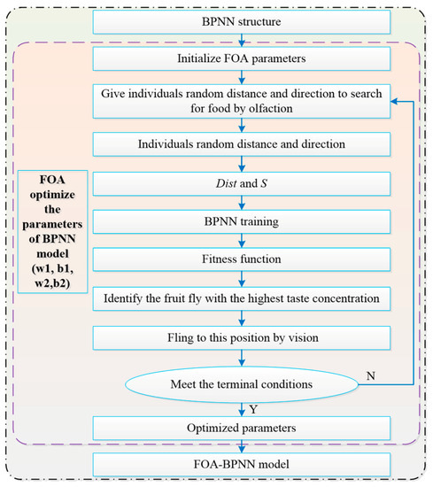 In addition, as proposed by Wen-Tsao Pan [32], the FOA is a new method of global optimization, which is based on the foraging behavior of Drosophila melanogaster. Because the fruit fly is superior to other species in terms of smell and vision, the olfactory organ of Drosophila can collect all kinds of smells floating in the air, even the smells of food sources 40 km away. Then, after flying to the vicinity of the food location, they can use their sharp vision to find the food or observe the gathering position of their companions, and fly in that direction. The optimization procedure of the FOA-BPNN is shown in Figure 3.