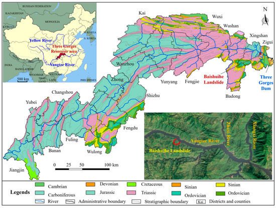 The Three Gorges reservoir is an artificial lake formed after the completion of the Three Gorges hydropower station, situated in the middle part of China. The total lengths of the Yangtze River and surrounding area are 660 km and 1084 km2 respectively. The altitude drops from the highest part to the west and east, forming a hilly landform and medium altitude mountains, respectively. The trend of the mountains is controlled by the main geological structures. The strata in the Three Gorges Reservoir area are from pre Sinian to Quaternary. Jurassic red strata are dominant in the Three Gorges Reservoir area, mainly exposed in the west of Zigui county east of Fengjie county (the red strata refer to sandstone, mudstone, and sandstone interbedded with mudstone layers). In addition, other sedimentary rocks (limestone, marl, and dolomite) also exist in the area between Fengjie and Zigui. These hard rocks form a steep canyon in Fengjie–Zigui area. Metamorphic complexes and magmatic rocks appear in the area near the dam site on a relatively small scale. Controlled by the complex geological conditions, coupled with seasonal rainfall and periodic fluctuation of reservoir water level, a large number of geological disasters have developed in the Three Gorges Reservoir area. A total of 4429 geological disasters have been found up to the present time, most of which are landslides, rock falls, and debris flows [4]. A geological map of the Three Gorges Reservoir area is shown in Figure 4.