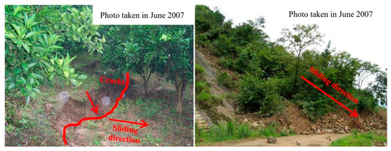The Baishuihe landslide has been monitored since June 2003, and the layout of the monitoring surface layout is shown in Figure 5b. According to the characteristics of the surface monitoring displacement and surface macro-deformations, the Baishuihe landslide can be divided into two areas; however, the active area (area A) is the middle and front part of the landslide, which has strong deformation. After the completion of the Three Gorges Dam, the landslide has produced obvious displacement due to the impoundment of the reservoir. Several transverse tension cracks have appeared in the east of the landslide. Specifically, the eastern and posterior boundaries are basically connected, and the western boundary’s cracks are in the shape of pinnately distributed cracks. From August 2005 to August 2006, there were many landslides on the inner side slope of the riverside highway with an elevation of about 220 m, and many subsidence and tension cracks appeared on the surface of the landslide. Approximately 100,000 m3 of landslide debris piled on the road towards the rear of the active area in June 2007 (Figure 7).