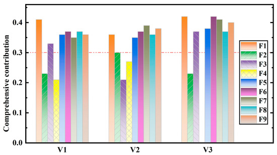 The statistical results of the data mining and association rules are shown in Table 5. The total support, average support, and the contribution without support of each triggering factor were counted, and the comprehensive contribution was the mean value of these three contributions. The comprehensive contribution of each factor according to the association rules is shown in Figure 9. Factors with a degree of contribution less than 0.3 were eliminated and were not used as input layers in the prediction model. Therefore, eight triggering factors were taken as the input layer in the V1 and V3 prediction models (F1, F3, F5, F6, F7, F8, F9, and F10), and eight triggering factors were taken as the input layer in the V2 prediction model (F1, F2, F5, F6, F7, F8, F9, and F10).