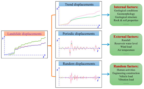 The non-stationary time series theory indicated that the time series consisted of three parts: the trend term, the periodic term, and the random term. For the landslide displacement, the time series can be divided into three parts: (1) trend displacement, which is controlled by internal factors, such as geological conditions, geomorphology, geological structure, rock and soil properties, etc.; (2) periodic displacement, which is controlled by external factors, such as rainfall, the reservoir’s water level, wind load, air temperature, etc.; and (3) random displacement, which is controlled by random factors, such as human activities, engineering construction, vehicle loads, vibration loads, etc., as shown in Figure 10.