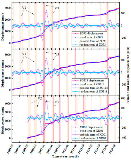 There are three monitoring sections and six GPS monitoring points in the active Baishuihe landslide area. Among them, the monitoring points ZG93 and ZG118 have been in place since June 2003; XD01 and XD02 were added in May 2005, and XD03, XD04 were added in October 2005. Note that the displacement of all the monitoring points is synchronous. The monitoring period of Points ZG93, ZG118, and XD01 is long, meaning that they are representative and can reflect the entire movement process of the landslide. Therefore, in this study, these three points were taken for detailed analyses (Figure 8). According to the filling scheduling of the reservoir, the monitoring data can be divided into three stages for analysis, as described below.