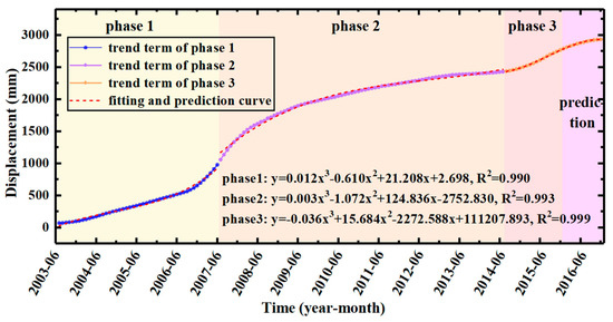 The displacement of the trend term showed a distinct piecewise function. Therefore, the trend term of ZG93 was divided into three phases: Phase 1 (June 2003~June 2007), Phase 2 (June 2007~June 2014), and Phase 3 (June 2014~December 2016). Multiple fitting results showed that good fitting results can be obtained by using a cubic function and the robust least squares method. The fitting function can be defined as: