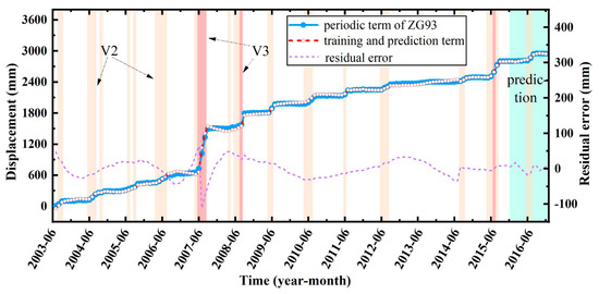 The total displacement prediction results of the landslide can be obtained by superimposing the prediction results of all three types of displacement, as shown in Figure 16, which shows that the prediction model achieved good accuracy for monitoring point ZG93. In June 2007, there was a significant difference between the total displacement training value and the actual value, resulting in the obvious mutation of the residual error. This was because in the three parts of landslide displacement (trend, periodic, random), the trend displacement accounts for more than 85%. In June 2007, it was the boundary between Phase 1 and Phase 2, where there were some differences in the training results of the two polynomial fitting functions, resulting in a large residual error in the total displacement. However, the residual error was relatively stable for the prediction samples.