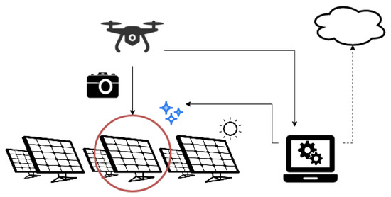 The system (Figure 2), which the algorithm is to be a part of, consists of a drone equipped with a high-resolution camera, an edge computing unit, automatic cleaning devices, and, optionally, may also consist of cloud computing. The principle of the system is as follows. The drone uses a camera to record video material showing PV panels in a given area. The recorded video material is sent to a computing unit, which extracts individual frames from the video. It then analyzes them using the algorithm proposed, in this work, to detect dirty PV panels [20]. After detecting such a module, information about the need to clean the PV modules is sent to the cleaning devices. The photos collected can be sent to cloud computing for further analysis, e.g., to improve the algorithm’s operation.
