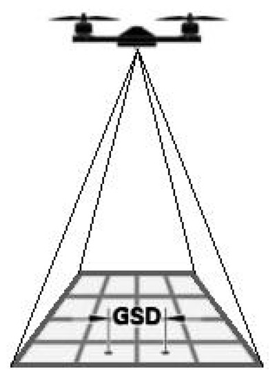 In the case of video materials obtained from a drone (digital sensors), spatial resolution, the Ground Sampling Distance (GSD) [21], is of crucial importance. It measures the distance in the field between the centers of two adjacent pixels (Figure 4). For each measurement mission of the drone, the GSD is defined before the task [22]. Typical values for this type of task should be in the range of 1.5 cm–45 cm. In the case of monitoring photovoltaic panels, it is necessary to determine which defects and the amount of dirt must be detected [23]. To detect panels with mechanical problems, set the GSD within 25 cm. To detect physical damage or points more minor than the entire panel, set the GSD between 5–16 cm. In the case of dust and dirt detection missions, set the GSD > 2 cm—this will allow you to detect even small contaminants on the panels [24]. The tested system uses RGB cameras with a resolution of 20 MP and a 1/1.7″ CMOS matrix (DJI Zenmuse H20).