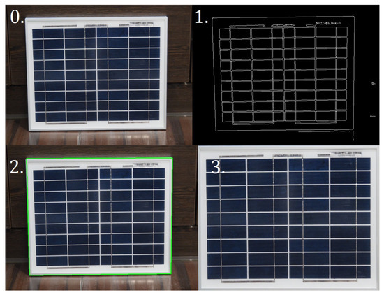 Successive stages of extracting the PV panel from the photo. 0—starting image; 1—detected edges in the picture; 2—outer edges of the PV panel found; 3—the result of the perspective transformation.