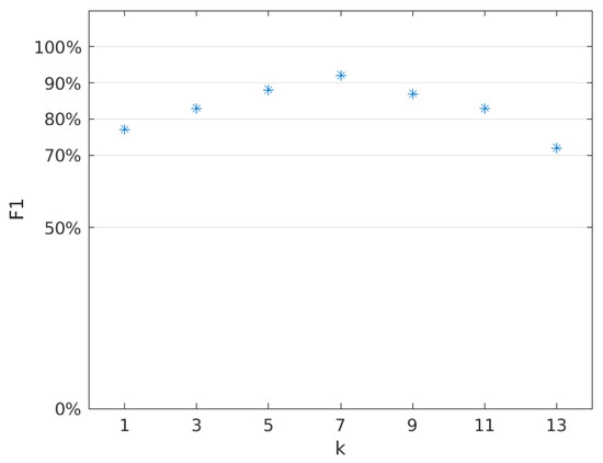 It can be concluded that the optimal value of the k parameter is 7. For this value, the kNN classifier is characterized by the highest sensitivity, specificity and precision. Additionally, the F1 metric reaches the highest value for k = 7, which can be seen in the Figure 12.