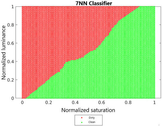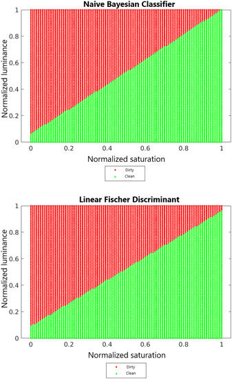 Figure 13 shows the decision surfaces of the classification of the 7NN classifier, the naive Bayes classifier and the linear Fischer discriminant. In order to compare these surfaces, the luminance and saturation values have been normalized so that, for each classifier, the values are determined from the same selected range.