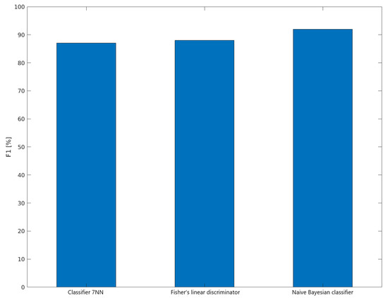 Based on the research, it can be concluded that the Naive Bayesian classifier is characterized by the highest efficiency of detection of contaminated panels. All metrics for this classifier are the highest and amounted to 92%. For the 7NN classifier, the TPR, PPV, NPV, and F1 values are lower than for the Naive Bayes classifier, and the TNR value is the same. As for the linear Fischer discriminator, the TNR, PPV, NPV, and F1 values are lower than for the Naive Bayes classifier, and the TPR value is the same. Figure 14 shows.