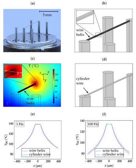 The high-resolution model (see Figure 1b) depicts a detailed reconstruction of the sensor geometry. The wire has a thickness of 8 , is wound in a radius of 50 , and fixed at two PINs of a TO Socket with a distance of above the bottom of the socket. The wire helix is surrounded by air. The detailed design will be explained in Section 4. The modules heat transfer in solids and fluids, as well as electric currents, were used in order to achieve Joule’s heating in and around a current-carrying conductor. Both modules are coupled using electromagnetic heating. A Dirichlet boundary condition was applied to the bottom of the TO socket. The temperature at the boundary, as well as the ambient temperature, were set to 20 . A sinusoidal current was applied between the ends of the wire helix. A time-dependent study was conducted for certain frequencies of the sinusoidal current. In Figure 1e,f, it can be noticed that the temperature distribution as a function of the cross-sectional coordinate x inside the wire helix is homogeneous after a transient time period for two exemplary frequencies (5 and 100 ). Slight deviations occur due to heat influences from adjacent wire windings. Outside the wire helix, a temperature decay is observable. This decay corresponds to the zeroth-order modified Bessel function (see Equation (4)).