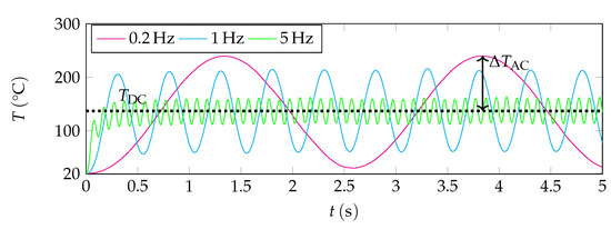 can also be seen in Figure 2, where the frequency dependence of the temperature oscillations is shown for three exemplary frequencies ( , 1 , and 5 ). Here, the temperature of the sensor measured at a central point directly on the cylinder surface is plotted versus time. As it can be seen from Figure 2, the temperature in this point oscillates around a certain level . The amplitude of these oscillations is marked with . Due to the thermal capacitance, respectively the low-pass behaviour of the sensor element, the amplitude of the temperature oscillations experiences an attenuation at higher frequencies. The RMS values of these amplitudes for different frequencies are compared to the results of the analytical model (see Equation (6)) and the experimental data in Section 5.