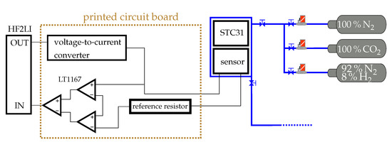 The sensor is connected to a circuit board, which in turn is connected to a digital LI (HF2LI from Zurich Instruments, Zurich, Switzerland). This LI has the advantage of an integrated 14-bit analog-to-digital converter (ADC). The LI is connected to a computer via USB and controlled by a Matlab code enabling a very fast integrated data acquisition. Another advantage of the HF2LI is its analog voltage output, which makes it possible to output a sinusoidal voltage with a certain frequency. The internal signal generation then automatically locks the lock-in amplifier to this frequency (or the third harmonic of this frequency, respectively). Otherwise, the process of frequency locking can be very time-consuming, particularly at low frequencies. The printed circuit board consists of two branches. The first branch is used to provide the signal as it converts the sinusoidal voltage signal provided by the LI into a current signal. This current signal is passed through the sensor and a reference resistor connected in series and then into the second branch. There, the voltage across the sensor and reference resistor is fed into two instrumentation amplifiers of type LT1167. The two voltages can be matched to each other by employing different gain factors, even if the resistance values of the sensor and reference resistor differ from each other.