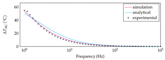 The simulation data of the temperature oscillations were also obtained at different frequencies. The amplitudes were extracted for the second half of the time-dependent studies (see Figure 2) and the corresponding RMS values were calculated. This ensures that the amplitude does not change anymore. A power-curve fit of the simulation data, the analytical solution, and the results of the measurements are visualized in Figure 4. The results of the analytical solution differ slightly from those obtained in the simulation and experiment. This might be due to deviations of the model from the real case, e.g., different heat capacities of the simplified geometry (analytical study, numerical study) and the real geometry (experimental study), and heat loss via suspensions (see Section 2). In addition, the influence of convection which can be seen in Figure 1c is not entirely negligible. Furthermore, the PINs where the wire helix is fixed have a large heat capacity which is not considered in the analytical study at all. In general, however, the basic trend of the analytical solution is well represented and thus suitable for the qualitative description of the effects. However, most of the effects that are missing in the analytical study are taken into account in the simulation. Therefore, the results of the numerical study are in better agreement with the experiment. As the distance between the sensor element and heat sink is rather high ( ), the thermal penetration depth is supposed to have almost no influence on the analytical and numerical studies—only the deviation towards very low frequencies between simulation and experiment might be associated with a rising influence of the thermal penetration depth.