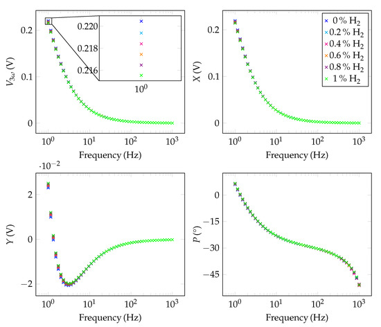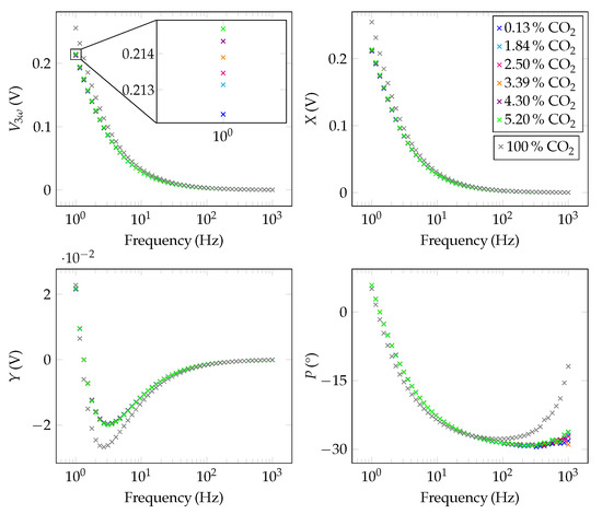 In our setup, the digital lock-in amplifier does this automatically [52]. These parameters were recorded at 50 different frequencies from 1 to 1000 . In this context, we first waited for 10 oscillations to ensure that the system has been stabilized; after that, the values for , X, Y, and P were then averaged over 20 oscillations with a 30 −1 sampling rate for each frequency. The results can be seen in Figure 5. The lower the excitation frequency is set, the better is the discriminability to different gas mixtures. This is especially recognizable for the amplitude, the in-phase component, and the out-of-phase component. As X and Y move to zero in the high-frequency range, errors in the phase-lag P become more noticeable in this range and distort the measurement. These uncertainties mainly arise from time lags of the electronic components used between signal provision and data acquisition, e.g., voltage-to-current converter or instrumentation amplifiers.