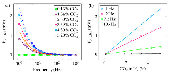 (a) Differential sensor response for carbon dioxide with respect to 100% ( CO2) as a function of the frequency. In the low-frequency range (from 1 Hz to 10 Hz) the values are well distinguishable. (b) Differential sensor output as a function of the CO2 concentration in the single-digit percentage range plotted for on the data point at 0% CO2. The slope of the linear regression curve gives a hint to the sensitivity of the setup, i.e. the higher the slope, the higher the sensitivity.