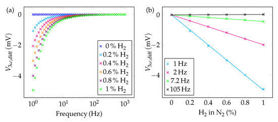 In this context, Figure 8a shows the differential sensor response with respect to 100% of nitrogen. The measurement points are equidistantly spaced at all frequencies. This is also shown in Figure 8b, where, similar to the measurements, the sensor response was plotted against the concentration. Here, the straight lines show a negative slope. This is due to the fact that the thermal conductivity of hydrogen is higher than that of nitrogen. Therefore, compared to 100% , the amplitude of decreases. Again, if we look at the sensitivity for 1 and 105 , we find values of %−1 and %−1, respectively, from the magnitude of the slope.
