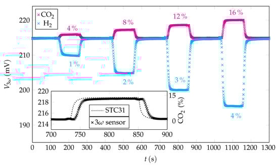 Different and concentrations vs. time. Due to the lower limit of the MFCs, the concentrations had to be increased with respect to the concentrations measured before. causes a reduction in the thermal conductivity and therefore results in a higher output signal, whereas has the contrary behaviour. The inbox plot shows an exemplary comparison of the signal of our sensor to the output of an STC31 reference sensor at 12% in . The response time of the sensor is about 10 delayed with respect to the reference sensor.