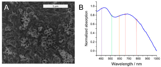 Optical characterization was carried out using UV-Vis spectroscopy in reflection mode. Two broad absorption peaks centered at ca. 430 nm and ca. 700 nm were observed in the absorption spectrum (Figure 1B), indicating optical activity over a large fraction of the visible spectrum. Previous studies have reported similar absorption profiles for nanostructured TiN and attributed those to the distinct plasmonic activity of the material [1,15,28]. LSPRs of TiN created upon light illumination have been proposed to manifest as broad absorption features that are located at specific frequencies characteristic for the specific nanostructure geometry. This shows that the created nanostructured TiN electrode exhibits high plasmonic activity that is comparable to previously presented systems in the literature.