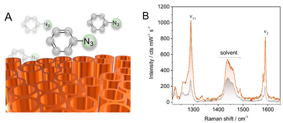 (A) Schematic representation of azidobenzene on TiN. (B) 647 nm Raman spectra of 0.5 M azidobenzene in tBME/acetonitrile in solution (grey trace) and at the TiN surface (orange trace), respectively.