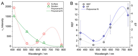 (A) Raman intensity of the ν7 mode of AB in solution (green) and at the TiN surface (red) as a function of laser excitation wavelength. (B) Raman enhancement factor (REF) (blue) and enhancement factor (EF) (black) calculated from the data according to Equation (1) as a function of excitation wavelength. Lines correspond to polynomial fits to the data set.