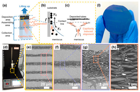 To date, direct growth and solution-based assembly are two important methods to obtain aligned carbon nanotube (CNT) arrays [8]. In the former method, chemical vapor deposition (CVD) is the most promising approach because of controlled growth and inexpensive fabrication [6]. Nevertheless, there is room for high s-SWCNT density and purity for future applications. Moreover, this method usually requires a temperature of >800 °C [8]; therefore, it is currently incompatible with organic or flexible electronics. Due to the synergistic contribution of solution-based purifying techniques by type, diameter, and chirality using density gradient ultracentrifugation [9], column chromatography [10], and aqueous two-phase extraction [11], the solution-based assembly method has drawn considerable attention because it is easy, inexpensive, and able to cover a large area at room temperature [8,12]. Dip-coating, a typical solution-based assembly approach, is quite simple [13] in processibility, efficient in fabrication [14], scalable [15] for large and non-planar substrates [13,16], and reproducible for mass production [15,16].