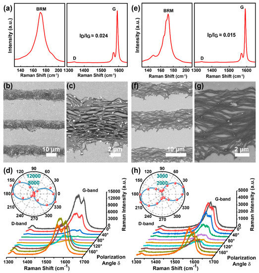Figure 2b,c,f,g show the high- and low-resolution SEM images of as-deposited SWCNT (types P1 and P2) stripes in randomly selected regions, excluding places close to the substrate edge to avoid the boundary effect [23], as well as a concave shape and convergent stripes. The concave-shaped stripes are possibly caused by an observably concaved meniscus because of different interfacial energies between the Si/SiO2 substrate and polycarbonate container walls. Both groups of SEM images show a high degree of alignment. They are then quantified via polarized Raman spectra. Figure 2d,h show spectra in the vicinity of the G band from 1300 to 1700 cm−1 as a function of angle, , between the polarization of the Raman excitation laser and the stripe long axis. The G band intensity versus is plotted in polar coordinates (insets in Figure 2d,h), indicating an intensity ratio of 44.6 and 11.4 between the maximum Raman intensity () and the minimum Raman intensity (), respectively.