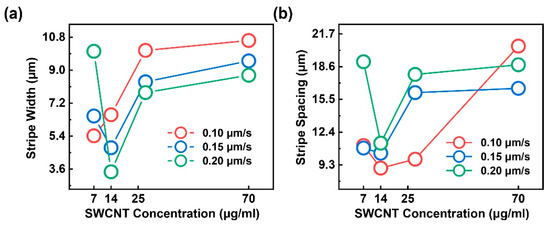 (a) shows the SWCNT stripes width as functions of the concentration and withdraw speed; (b) is the SWCNT stripe spacing as functions of the concentration and withdraw speed.