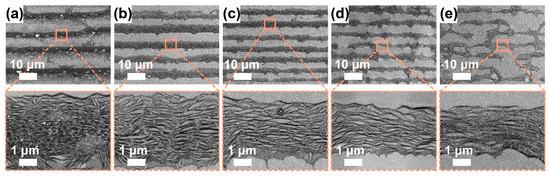SEM images for P3-SWCNT films at a fixed SDS concentration (~1.0 mg/mL), withdrawal speed (0.1 μm/s), environment temperature (~17 °C) and humidity (~50–70%), but varied SWCNT concentrations: (a) ~70.0, (b) ~25.0, (c) ~14.0, (d) ~9.3, and (e) ~7.0 μg/mL. To characterize the alignment of SWCNTs in stripes, high-resolution SEM images were shown below.