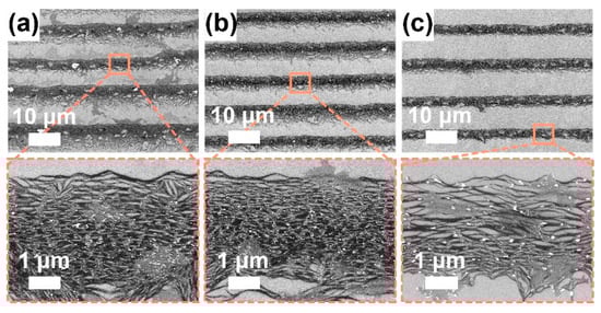 Subsequently, for the P3-SWCNT solution at a fixed concentration of 70 μg/mL, we adopt three different withdrawal speed of 0.10, 0.15, and 0.20 μm/s, to study the withdrawing effect. In the low-resolution SEM images (Figure 5a–c), the perpendicularly oriented clusters gradually disappear as the withdrawal speed increases to 0.20 μm/s. Therefore, it may be a withdrawal speed-related phenomenon involved with the capillary flow, as reported by Li et al. [42]. In the high-resolution SEM images (Figure 5a–c), the alignment in the stripe seems to remain, and the film thickness seems to decrease because faster withdrawing allows fewer particles to be transported to the assembling area and results in thinner stripes [49]. However, as shown in Figure S3, the fast withdrawing (0.20 μm/s) seems to deposit in a discrete stripe-like pattern with great degradation in ordering degree, when the SWCNT concentration becomes moderate (~14 μg/mL). Eventually, fast withdrawal (0.20 μm/s) allows the deposition duration to accelerate from a few days (at a zero-withdrawal speed) to ~10 h for a 1.0-cm-long substrate.