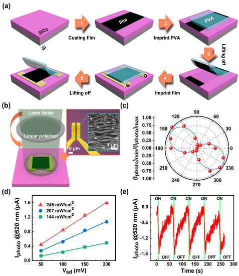 (a) A regular 2D film transferring process applied to the SWCNT film; (b) Schematic of photoresponse measurement for a two-terminal device; (c) Polarization-dependent photocurrent observed for aligned SWCNTs; (d) Photocurrent as a function of bias voltage under different incident power; and (e) Temporal photoresponse of measured under of 200 mV.