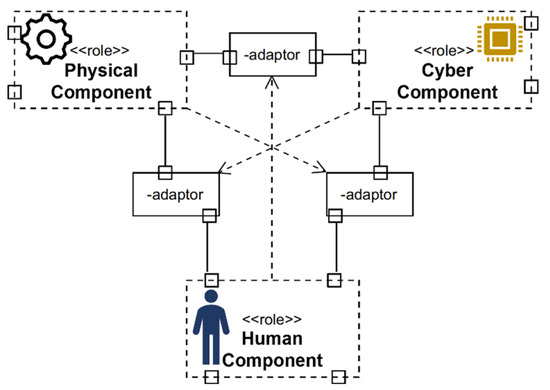 The assembly assistance system is a flexible training prototype for manual operations that allows the deployment and evaluation of adaptive training effects in the case of inexperienced operators without the support of an expert human trainer. Conceptually, it was designed to go beyond the classical approach of a cyber–physical system, in which a human–machine interface is encapsulated within a device, by following the anthropocentric cyber–physical system reference model approach [40] (see Figure 1). In anthropocentric cyber–physical systems, the social dimension is an integral part within its infinitesimal model and is essential for continuous adaptation between the physical, cyber, and human components.