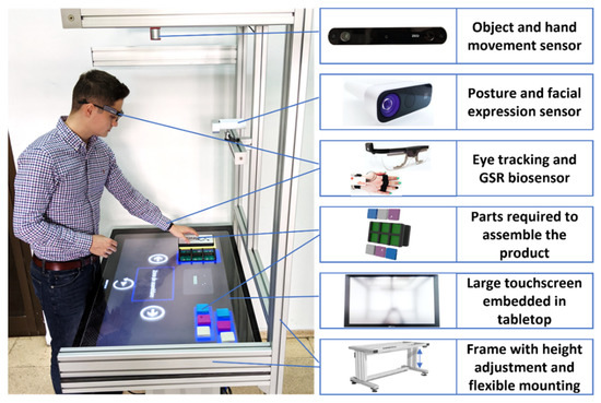The assembly assistance system is composed out of five main components. The first component is the aluminum profile frame designed for the easy positioning and installation of the required devices. Electrical actuators are embedded in the frame to vertically adjust the tabletop. The second component is a Sensytouch ST43 SLIM large touch screen. It is used for displaying instructions and providing the hardware for running the training application (see Table 1 for its specification). The third component is a set of biosensors, such as Tobii Pro Glasses 2 and Shimmer GSR, which are worn by the user during the training. If required, additional sensors, such as for electroencephalograms, electromyography, and heart rate, can be added. The fourth component is a front-facing Microsoft Azure Kinect sensor for posture and facial expression estimation. Finally, the fifth component is the Zed 3D camera, positioned above the user and oriented towards the assembly table for tracking hands and the relevant components for the assembly training.