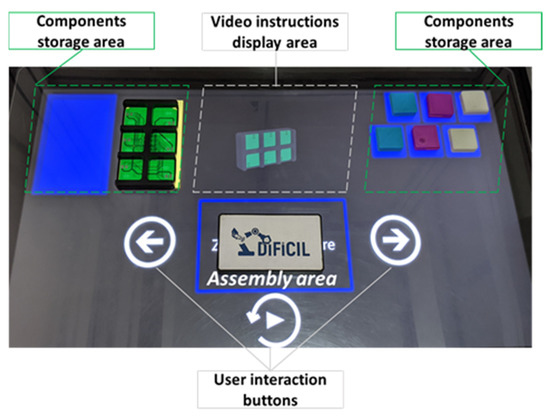 Before the training starts, the product’s components are placed disassembled in the designated areas (i.e., upper left side and upper right side) on the tabletop, as in Figure 3. The large touchscreen displays where the subcomponent’s initial location should be and provides video animations and user interaction buttons (i.e., play/pause, backward and forward), which enable the control of the training scenario.