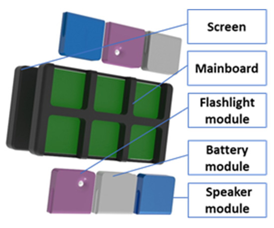 The product used in our evaluation is a customizable modular tablet (Figure 4) that can be configured with one screen, one mainboard, and up to six modules of three types (i.e., flashlight, battery, speaker). The assembly process can start with any of the components mentioned before, and it is not restricted to a single assembly recipe. More details about the prototype’s concept and its subsystems and feature developments are detailed in [41,42,43].