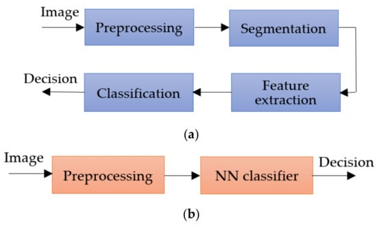 The inconveniences caused by these factors led the authors to expand their research a lot but, in principle, most approaches use the same classical method in which the first step is the preprocessing step, followed by segmentation, feature extraction, and then the classification step. The main workflow of the classical method is as shown in Figure 2.