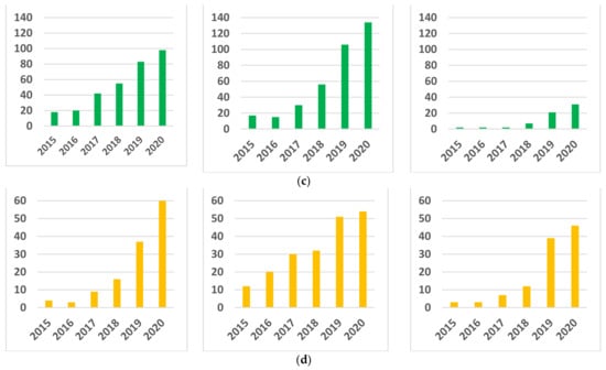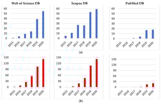 Searches for important terms in the Web of Science, Scopus, and PubMed DBs between 2015 and 2021 with the AND connector: (a) CNN AND Me, (b) DL AND Me, (c) ML AND Me, and (d) AI AND Me.