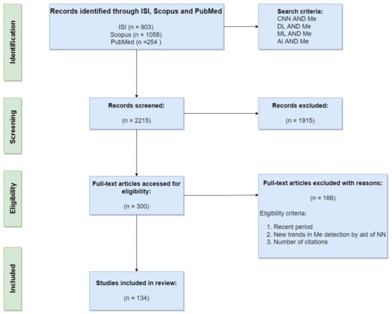As many as 300 full-text papers were analyzed from Web of Science, Scopus, and PubMed, of which we selected 134 research papers for this review. The main criteria for paper selection were: the recent period, new trends in Me detection by the aid of NN, visibility, and impact of contributions (publishing in high-rank conferences and journals, number of citations). The most representative articles covering melanoma detection based on neural networks, published in journals and impact conferences, were investigated between 2015 and 2021 (92% of references), focusing on the interval 2018–2021 (80% of references) as a recent period. In terms of new trends of using NNs for detection, segmentation, and classification of Me, we noticed the following directions: systems using one single CNN most often modified and adapted for Me, systems using multiple CNNs, and systems using CNN combined with other classifiers. Details will be given in Section 5. Although the number of citations is relative, in general for older papers it is higher than for new ones (2021). However, obviously, there are exceptions. Due to this, we did not set a threshold for the number of citations. We had in mind that most papers follow what we have stated as new trends and obviously have a reasonable number of citations. The high-rank of the journal refers to Category Quartile Q1, Q2, and the Journal Impact Factor greater than 2.2 in Web of Science 2020. About 50% of the total references meet this criterion. For the systematic review and meta-analysis, we used a PRISMA (Preferred Reporting Items for Systematic Reviews and Meta-Analyses) flow diagram (Figure 4).