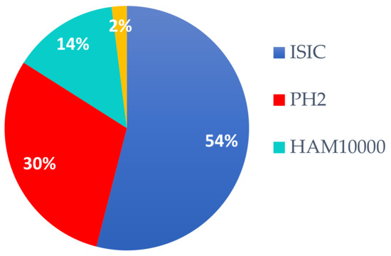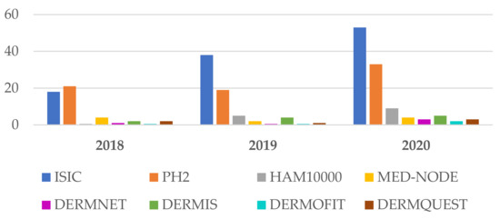 According to our study, as can be seen in Figure 5 (focusing on the period 2018–2020, as new trends) and Figure 5 (for 2021), the most widely used DSs in SL diagnosis research are the ones included in ISIC archives (containing also H10000). The first reason is that these DSs are quite consistent and very well labeled by domain experts, and the second reason might be the annual challenges posed by consistent prices. The second place is occupied by PH2, which is a small DB but, according to our study, the trend is to use small DSs for system/solution validation and to use large DSs for learning such as with DL and TL (transfer learning) systems. As can be seen in Section 4, data augmentation is frequently used. For the year 2021, a separate evaluation (based on percentage) is presented in Figure 6. It can be observed that the trend is maintained (54% ISIC and 30% PH2).