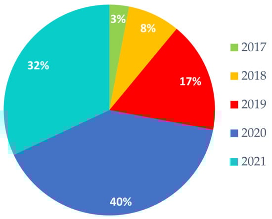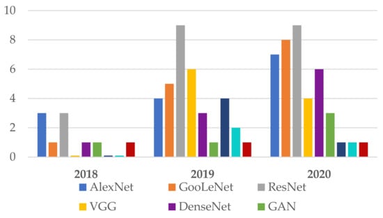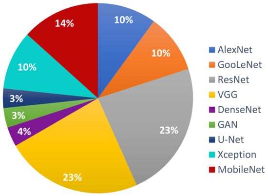 Following the investigation of the Web of Science DB between the years 2018 and 2020 (Figure 7), it can be found that the most used NN in the detection of Me were those in the family ResNet, followed by the families: VGG, GoogLeNet, and AlexNet. For the year 2021, the tendency is for ResNet and VGG networks (Figure 8). Figure 7 marks the number of appearances in the years 2018, 2019, and 2020, and Figure 8 the percentage of appearances in 2021 (unfinished year).